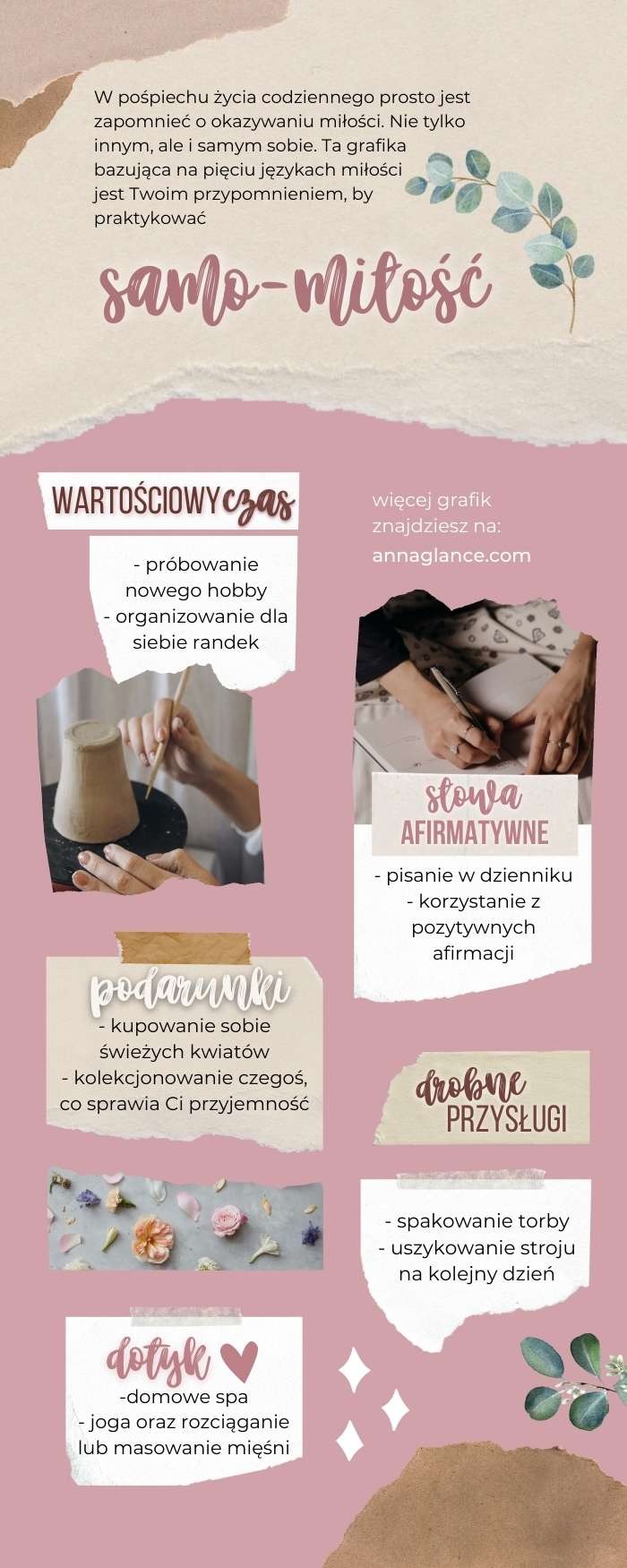Grafika z propozycjami na kochanie siebie na podstawie pięciu języków miłości.