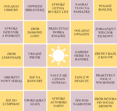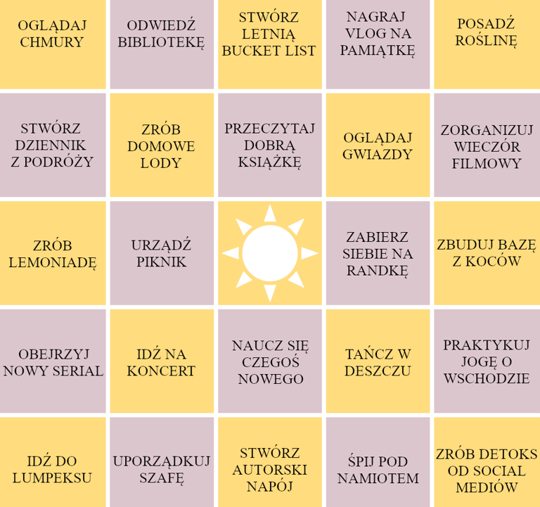 Nadeszło lato, a razem z nim wakacje, które często oferują nam większą ilość wolnego czasu, który musimy jakoś spożytkować. Spisałam listę letnich aktywności i złożyłam je w całość w formie kolejnej grafiki BINGO.