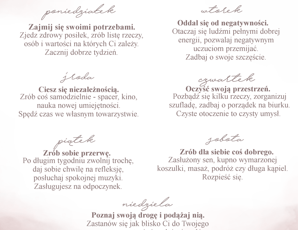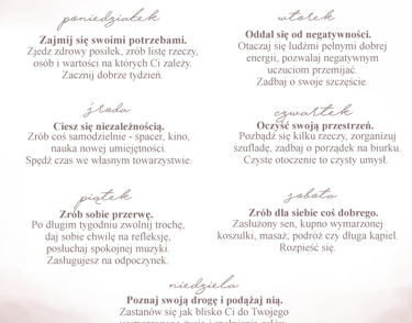 Istnieje masa sposobów na to, by dbać o siebie. Poniższa grafika przypomni Ci o tym, by robić to siedem dni w tygodniu.