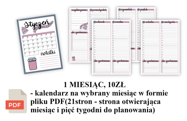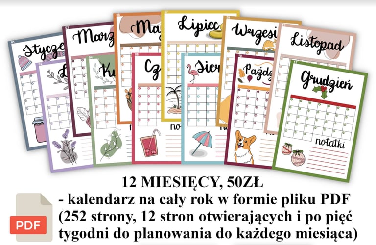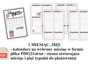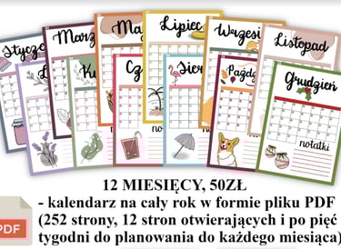 Stworzyłam kalendarze uniwersalne (odpowiednie na dowolny rok) w wersji elektronicznej, które możesz drukować i używać przez wiele lat pod rząd. Plik PDF zawiera 12 stron otwierających (kalendarze miesięczne) oraz miejsce na plan tygodniowy oraz dniowy z harmonogramem.
